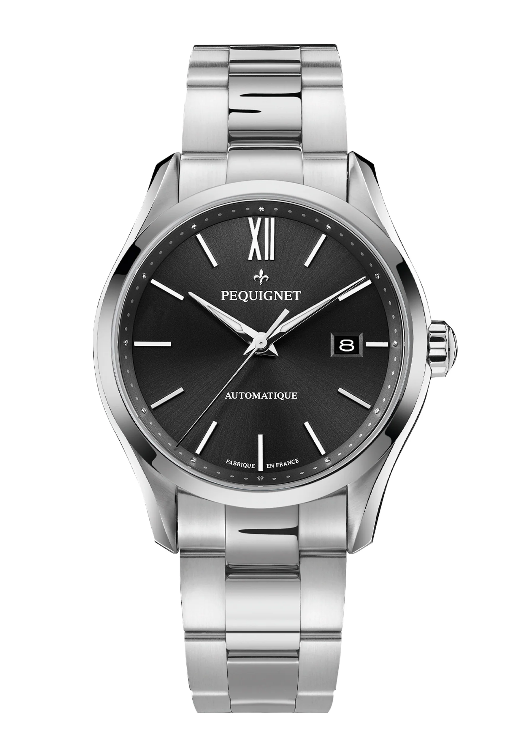 En adoptant un cadran ainsi qu'un bracelet noir, ce modèle souligne l'élégance de ses index et de ses aiguilles. La lecture du temps est ainsi facilité et précise grâce au guichet date se trouvant à 3h. De plus, cette montre est munie d'un mouvement automatique suisse qui lui octroie sa fiabilité à toute épreuve.Le design de la collection Élégance est un clin d’œil au classicisme des montres Suisses, interprété avec une touche d’élégance française. Elle se décline dans deux formats pour les femmes, et en version automatique ou chronographe pour les hommes.