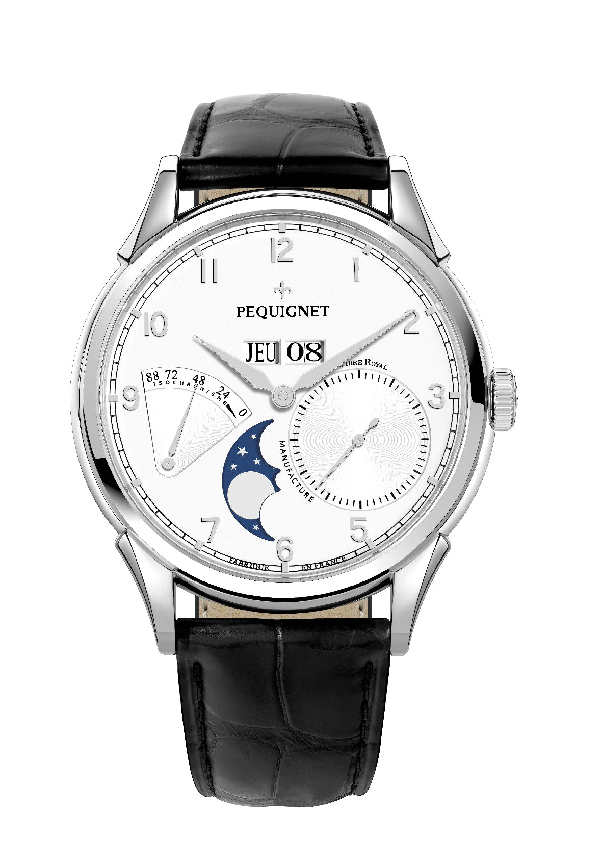 La collection Royale est animée par le Calibre Royal®, conçu, prototypé, contrôlé et assemblé dans les laboratoires de Haute Horlogerie Pequignet à Morteau. Sa conception a nécessité pas moins de 279 plans industriels ; il est fait de 318 composants dont 316 ont été dessinés spécifiquement par la manufacture. Doté de 8 brevets internationaux, le Calibre Royal® est un véritable chef d’œuvre d’innovation… et 100% Français ! Les amateurs d'horlogerie seront charmés par son fond de boîte transparent qui laisse entrevoir le balancier et l'ensemble du mouvement. La masse oscillante est positionnée de façon à laisser une grande visibilité. Le grand balancier, l’ancre et la roue d’ancre se laissent contempler sans difficultés.